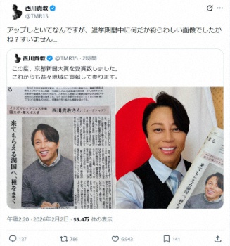 西川貴教 「選挙期間中に何だか紛らわしい画像」に反響「勘違いされる方も」「うれしい画像」の声