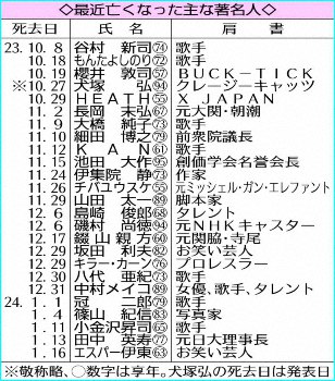 昨年から相次ぐ著名人の訃報 谷村新司さん、HEATHさん、坂田利夫さんら