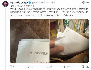 ごみ清掃員としても働くお笑いコンビ「マシンガンズ」の滝沢秀一(49)が10日、自身のX(旧ツイッター)を更新。 「【今日のごみトリビア】出さないよ…