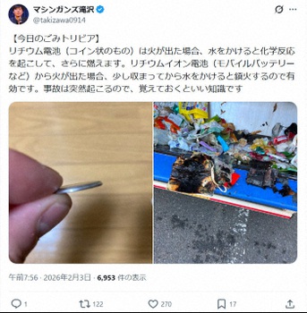 ごみ清掃員としても働くお笑いコンビ「マシンガンズ」滝沢秀一(49)が2日、自身のXを更新。危険なごみの捨て方に注意喚起した。 滝沢は「この方は完全…