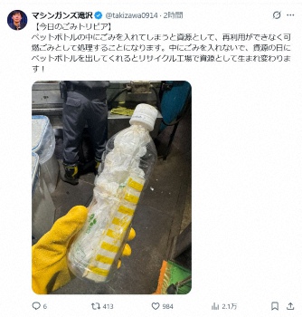 ごみ清掃員としても働くお笑いコンビ「マシンガンズ」滝沢秀一(49)が12日、自身のXを更新。間違ったごみの分別に注意喚起をした。 滝沢は「ペットボ…