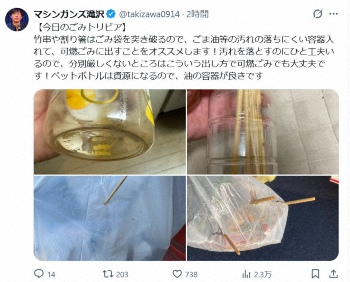ごみ清掃員としても働くお笑いコンビ「マシンガンズ」滝沢秀一(49)が16日、自身のXを更新。ごみ出しの工夫を明かした。 滝沢は「【今日のごみトリビ…
