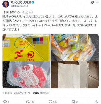 ごみ清掃員としても働くお笑いコンビ「マシンガンズ」滝沢秀一(49)が17日、自身のXを更新。紙パックのリサイクルを呼びかけた。 滝沢は「【今日のご…
