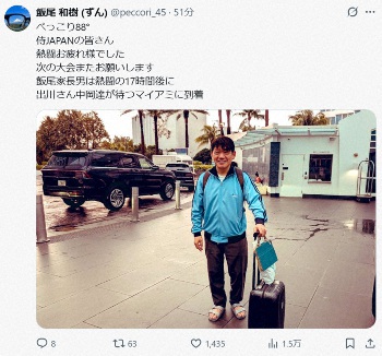 ずん飯尾 「熱闘の17時間後に…マイアミに到着」哀愁漂う到着写真を公開「次の大会またお願いします」