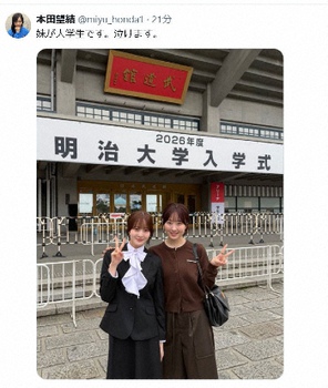 女優の本田望結(21)が9日、自身のXを更新。妹でモデルでタレントの本田紗来(18)が大学に入学したことを報告した。 望結は紗来との2ショットを投…