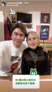 俳優の川崎麻世(63)が23日までに自身のインスタグラムを更新し、91歳の母との親子ショットを披露した。 ストーリーズに飲食店で寄り添い、母の肩に…