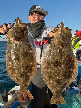伊藤ファンと豪華リレー船 夢見心地ヒラメWヒット マアジ泳がせ55センチ&52センチ