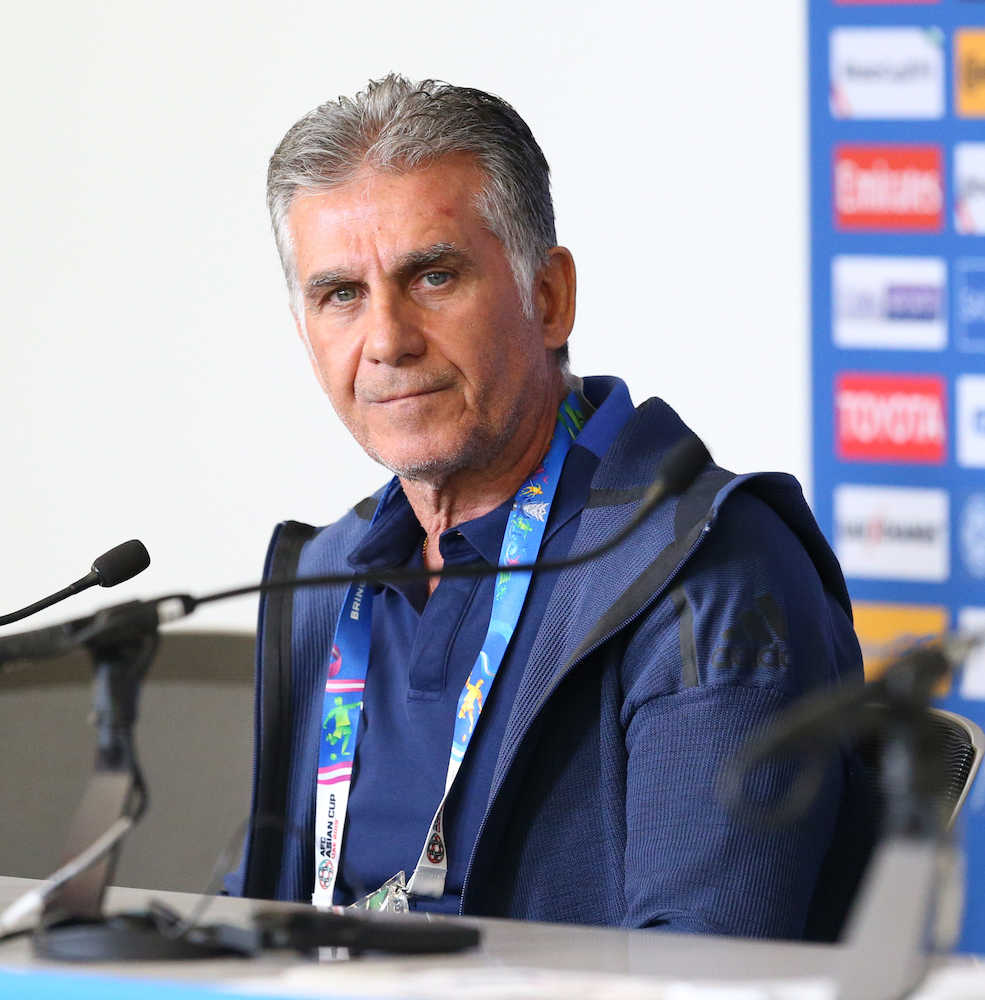 会見に臨むイラン代表・ケイロス監督(撮影・小海途 良幹)