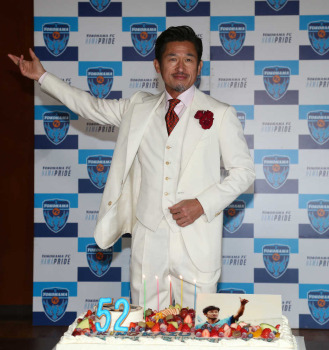 カズ 真っ白のスーツ姿で登場!52歳バースデー祝福され「Boa Sorte」