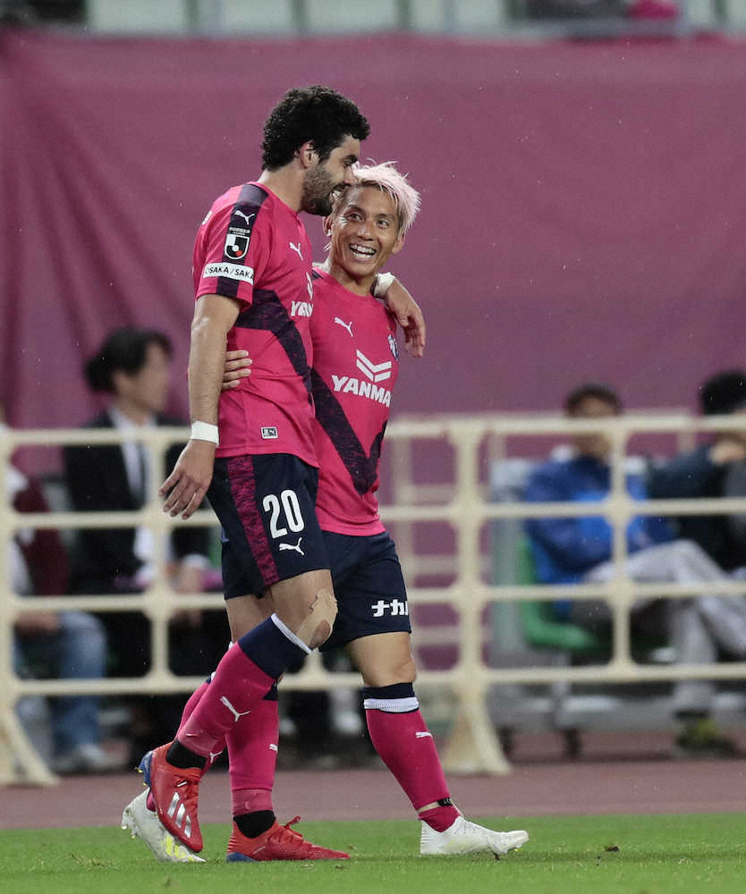 <C大阪・神戸>試合に勝利し、抱き合うC大阪のブルーノ・メンデス(左)と田中(撮影・後藤 大輝)