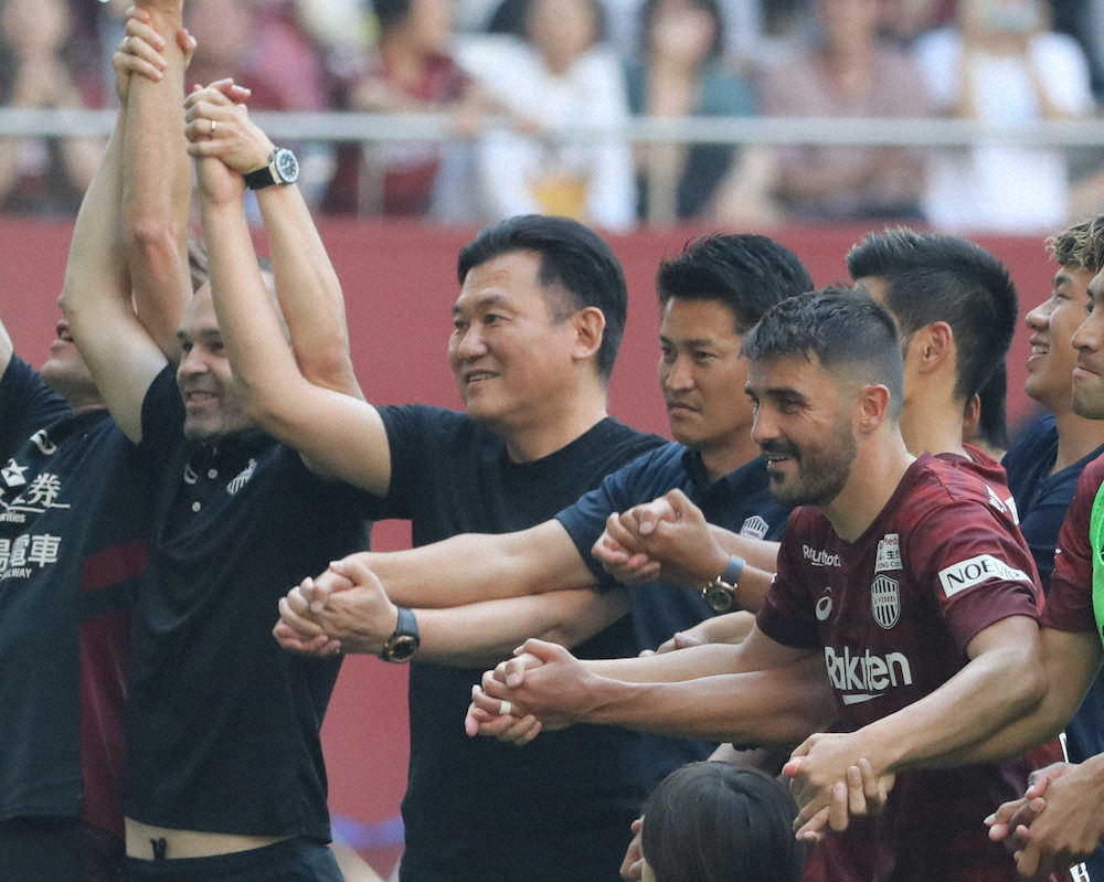 試合後のノエスタがお祭り騒ぎとなった。3月30日のG大阪戦以来となる約2カ月の白星を挙げ、神戸がリーグ戦の連敗を7、公式戦の連敗を9でストップ。サポーター席の前に整列した際には、ベンチ外の選手だけでなく三木谷浩史会長までもが肩を組み、熱い抱擁を交わした。