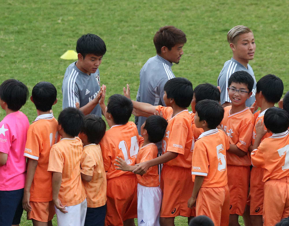 トレーニング前には豊田北小と豊田市を拠点に活動するペレニアルSCの子ども約80名を招き、記念の写真撮影を行った。A代表に初選出されたMF久保建英(17=FC東京)も小学生の肩に手を回して写真に収まった。