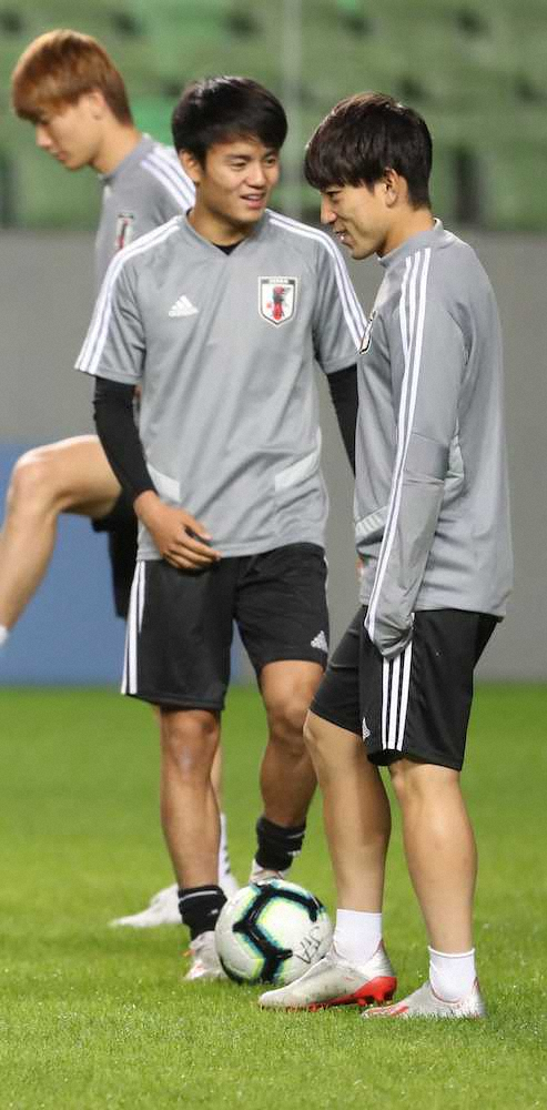 この日は、冒頭の円陣で森保監督が今回の遠征最長となる10分間の話を終えた後に、ウルグアイ戦先発以外のメンバーで練習した。ボールを奪われると18歳らしく奇声を上げたり、前田を後ろからホールドするシーンも。終始明るい表情で、引き揚げる際には1トップ候補の上田と話し込んだ。