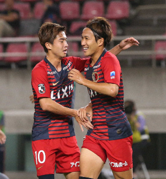 前半14分、ゴールを決めた金森(右)と喜ぶ鹿島・安部