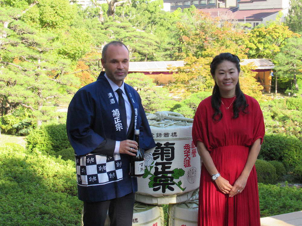 28日には神戸市内で「創業360周年記者発表会」が行われ、特別ゲストとしてイニエスタと元サッカー女子日本代表MFの澤穂希さんが登場。菊正宗の法被も着用し「サッカーのユニホームの方が慣れているけど、これも良いのかな」と笑顔を見せた。