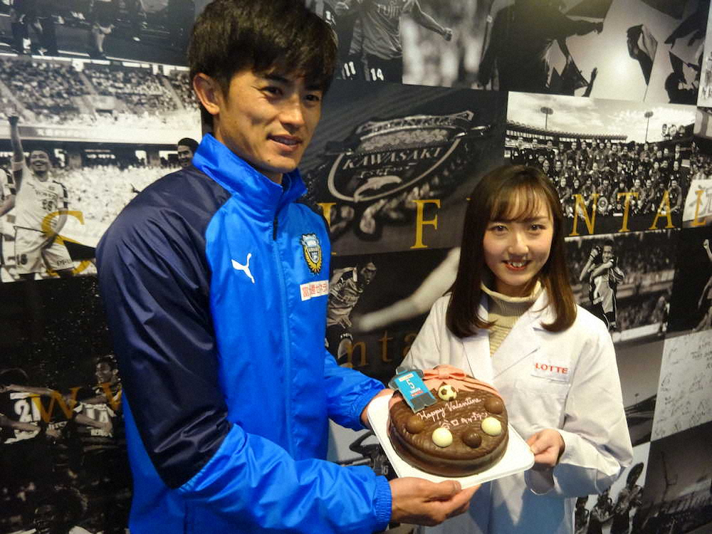 川崎F新主将のDF谷口にスポンサーで大手菓子メーカーのロッテから「史上最大級・アートチョコパイ」がバレンタイン企画で贈られた。