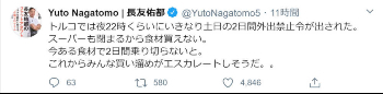トルコ1部リーグ・ガラタサライの日本代表DF長友佑都(33)が日本時間11日、居住するイスタンブールで突然の外出禁止令発表を受け、食料調達もままならない現状をツイッターで吐露した。「トルコでは夜22時くらいにいきなり土日の2日間外出禁止令が出された。スーパーも閉まるから食材買えない。今ある食材で2日間乗り切らないと」と、困惑の様子をつづった。