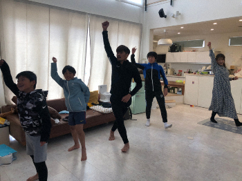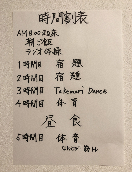 3時間目は、妻が運動不足解消のためにやっている通称「Takemari Dance」(YouTubeの人気ダンスチャンネル)で体を動かします。