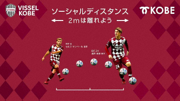 「ステイホーム」「うちで過ごそう」の画像にはイニエスタが、「ソーシャルディスタンス」の画像には酒井とサンペールが登場。30秒間のスライドが市内各所で放映されることで、不要不急の外出自粛の啓発に協力する。