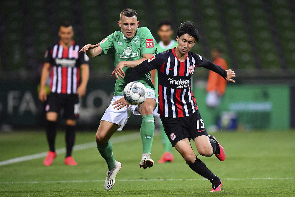 ブレーメン戦に先発し競り合うEフランクフルトのMF鎌田(右)(AP)