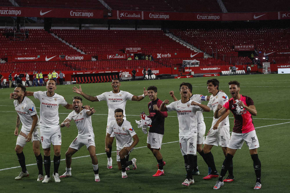セビリアは、ベティスとの再開初戦を白星で飾った。リーグからは選手へゴール後の接触を最小限にするよう通達が出ていたが、後半11分にMFオカンポスが再開1号となるPKを決めるとイレブンは互いに抱き合って歓喜。
