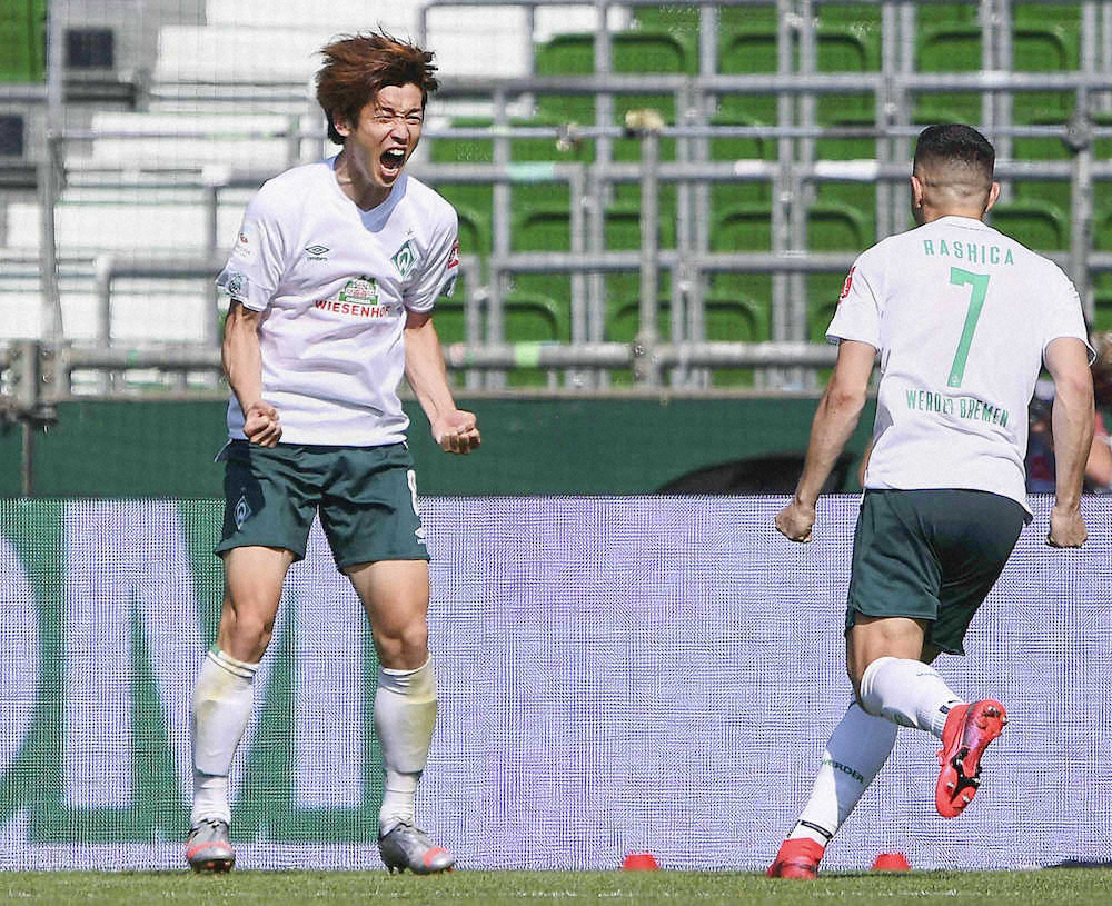 後半には自身2点目を決めてドイツで今季8点目。大勝したチームは勝ち点を31とし、同時刻開始で敗れた同30のデュッセルドルフを抜いて16位に浮上。逆転で2部3位との入れ替え戦(7月2、6日)出場を決めて、残留の望みをつないだ。