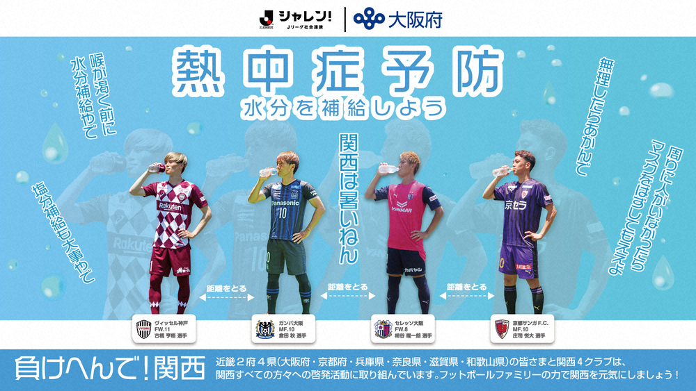 新型コロナウイルス対策、また近畿2府4県に「勇気」や「笑顔」を届ける活動で、今回は「熱中症予防」啓発のサイネージ画像を制作。「関西は暑いねん」と書かれた画像にはG大阪MF倉田、C大阪FW柿谷、神戸FW古橋、J2京都MF庄司が登場し、水分補給などを呼び掛けた。この日から各自治体で順次、掲出される予定。