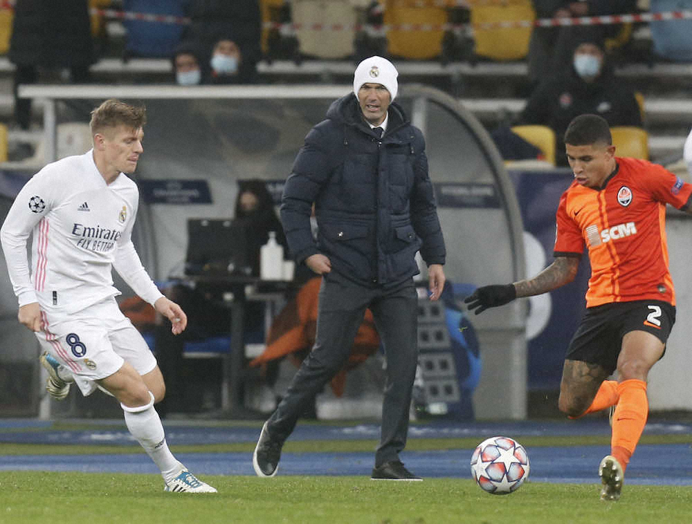 ドシャフタル・ドネツク戦で指示を出すレアルマドリードのジダン監督(中央)(AP)
