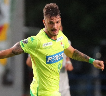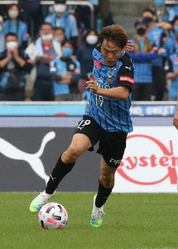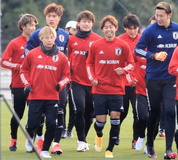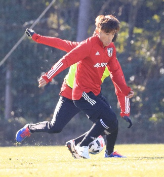 <U-23日本代表練習>ミニゲームで田中(右)を押さえてパスを出す斉藤