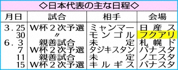 日本代表は4試合を終え、勝ち点12でF組首位に立つ。3月25日のミャンマー戦(日産)に続き、国内での連戦は負担も少なく追い風となる。ミャンマーは政情不安も心配されるが、同国連盟と連絡を取り合い「情報は得てます。3月の日程を消化し、最終予選の切符を決めたい気持ちは強い」と反町委員長。ホームで戦う“アウェー”モンゴル戦で2次予選突破を決める。