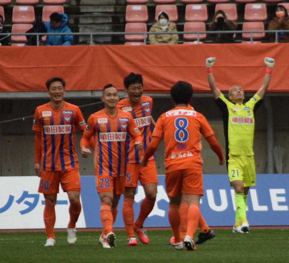 <新潟・長崎>ガッツポーズで勝利を喜ぶ阿部(右)らイレブン(撮影・棚橋孝太)