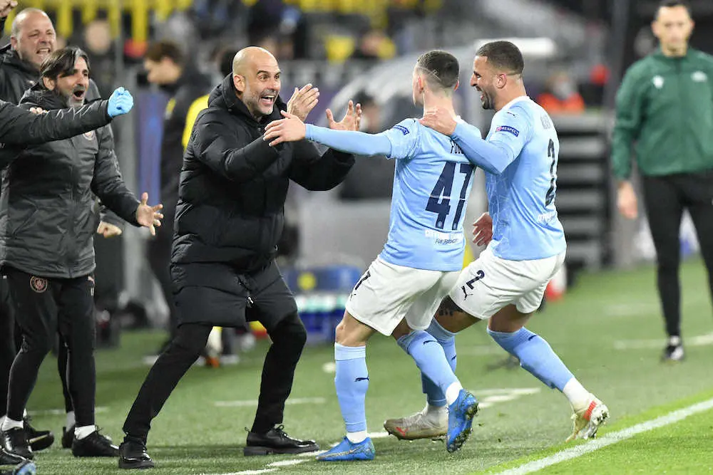 フォーデン(中央)の得点を喜ぶマンチェスターCのグアルディオラ監督(AP)