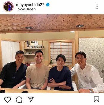 吉田がアップしたのはカウンターのような場所に4人が並んでリラックスした笑顔を見せるショット。「今日からオリンピック代表合宿スタートです!が、その前にこの御三方は載せておきましょう!良き先輩!良きアドバイザー!良きお財布!ゴチです!笑」とユーモアを交えて説明し、“先輩たち”との良い関係をうかがわせた。