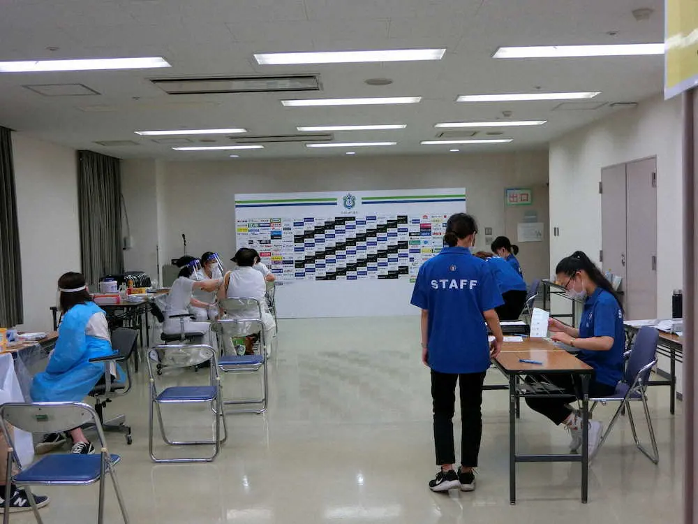 記者会見場や会議室などを使って人の流れが的確にできるようにして実施、「サポートの実施が地域貢献に繋がれば」と受託した湘南のクラブスタッフやアカデミーのコーチが交代で手伝い、接種はスムーズに行われた。