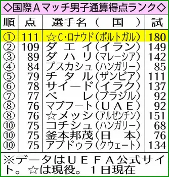 衰えない抜群の跳躍力を生かした。0―1の後半44分、右クロスを頭で合わせて追いつくと、アディショナルタイムにも同じような形から再びヘディングで決めて111点目。欧州最多記録に並ぶ代表通算180試合目で、109点で並んでいたダエイを抜いた。