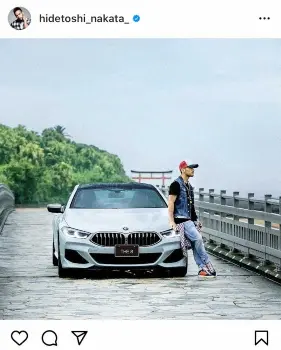 「『にほん』の『ほんもの』を巡る旅 宮崎」とつづり、奥に鳥居が見えるスポットで高級車BMWの「THE8」に腰掛けている姿を披露。自身はキャップを被り、ジーンズやスニーカーを取り入れたカジュアルなコーディネートに身を包んでいる。また、中田氏は2017年から同車ブランドの「ブランド・フレンド」に就任している。
