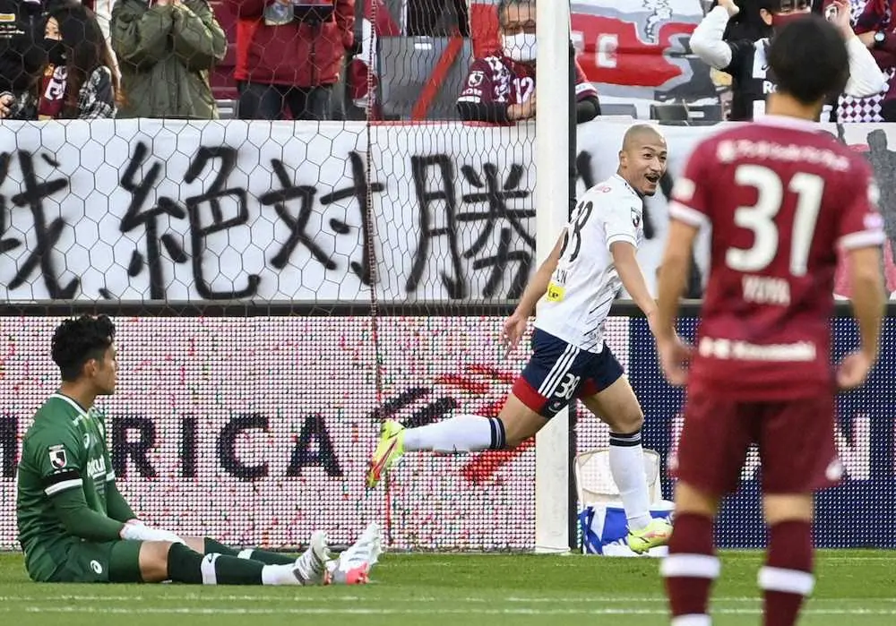 前半23分、前田が一瞬の隙を突いた。MF渡辺皓太(23)のパスを、FWレオ・セアラ(26)が前線へ送ると、浮き球のボールを前に相手DFとGKが見合った。その間に割り込んだのが前田だった。「隙を狙うのは自分の持ち味。ボールウオッチャーになるのを予測してトップスピードで入れた」。快足を飛ばしてワンタッチでGKの股下を抜くと、アンパンマン好きの愛娘の爽世(そよ)ちゃん(2)に、ドキンちゃんのパフォーマンスを届けた。