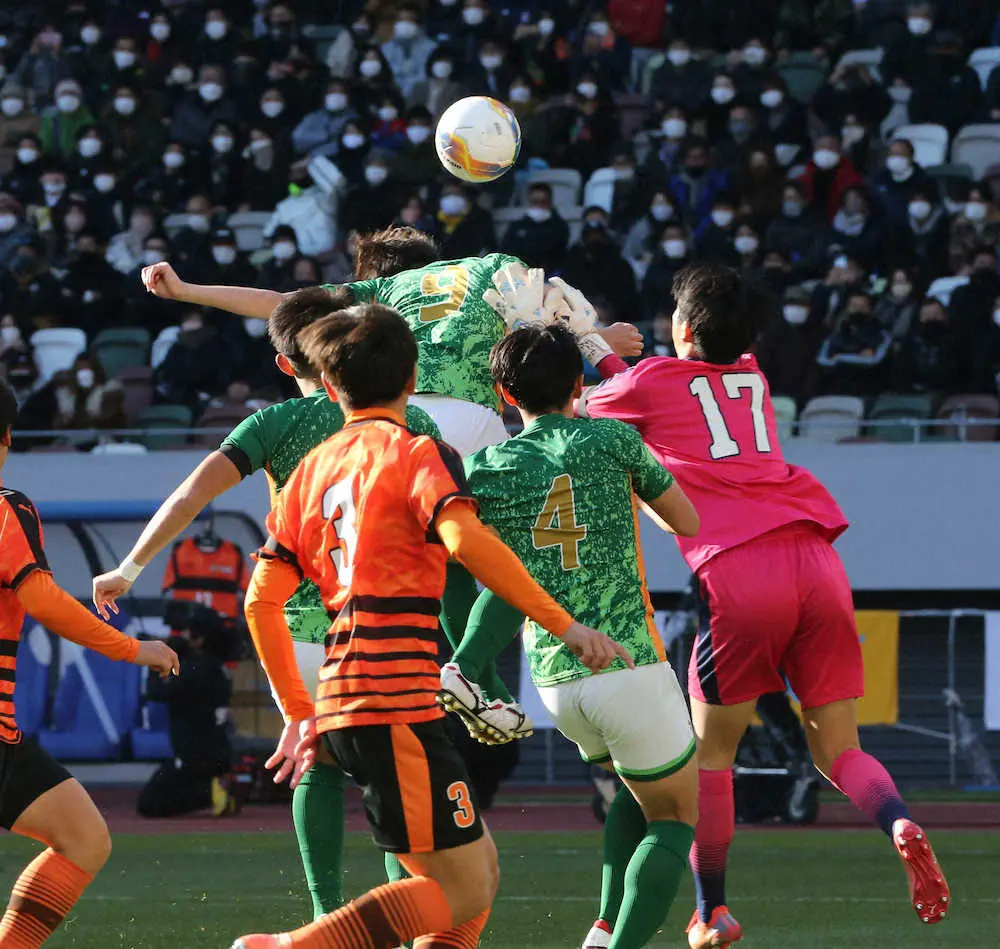 <高校サッカー準決勝 青森山田・高川学園>前半3分、高川学園は青森山田・名須川(9番)にゴールを決められる(撮影・西海健太郎)