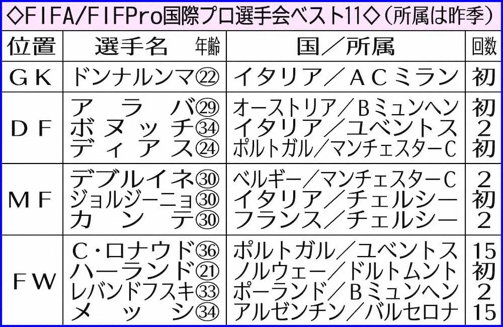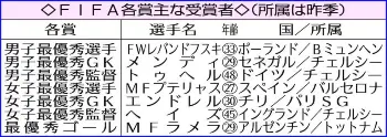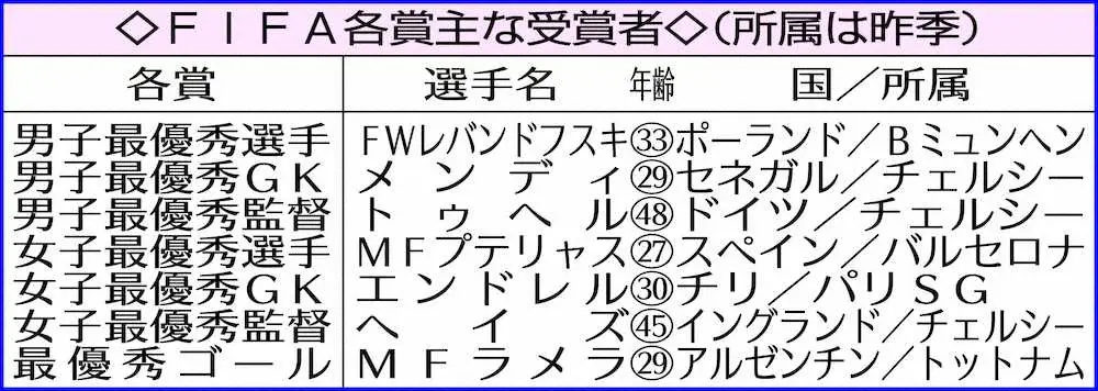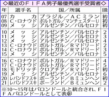 最近のFIFA男子最優秀選手受賞者 Photo by スポニチ レバンドフスキがFIFA最優秀選手、メッシ抑え2年連続「名誉と喜び感じる」 ギャラリーで見る この記事のフォト 2022年01月19日の画像一覧 もっと見る 2022年01月19日の画像をもっと見る