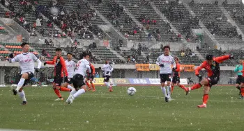 <山口-熊本> 雪の舞う中、ゴール前で激しい攻防を展開する両チーム