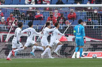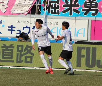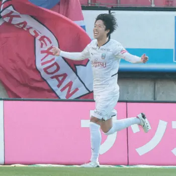 川崎F戦の後半、勝ち越しゴールを決め、ガッツポーズする横浜・仲川(撮影・木村 揚輔)