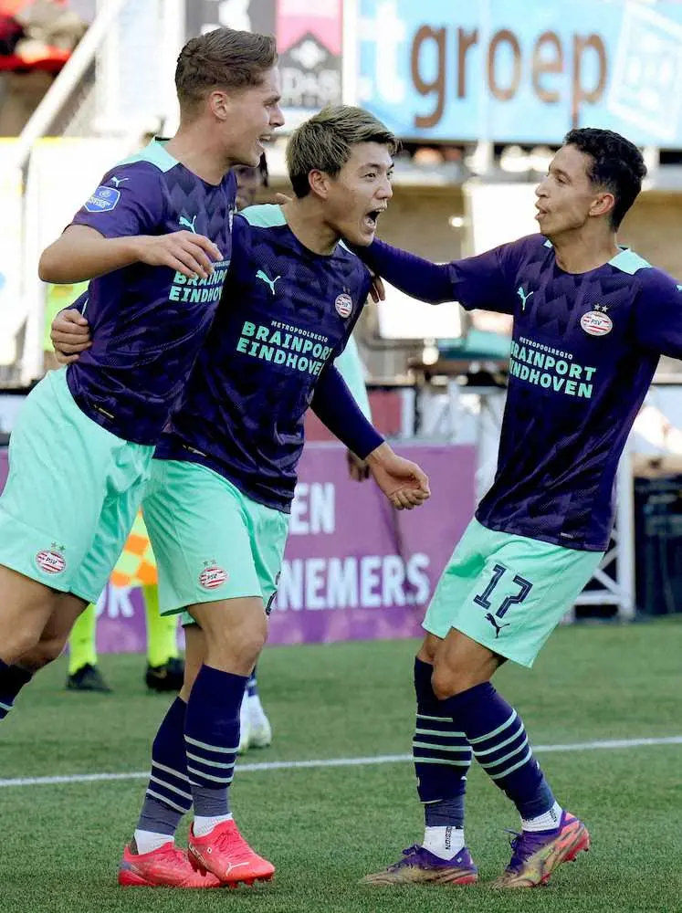 <スパルタ・PSVアイントホーフェン>決勝ゴールを決めて祝福される堂安(中央)=(共同)