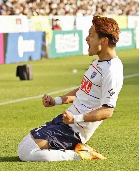 <福岡・FC東京>前半、プロ初ゴールとなる同点ゴールを決め、喜ぶFC東京・松木