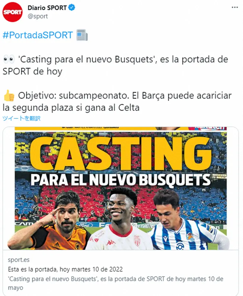 スポルト紙は今年34歳になるスペイン代表MFを“休養”させ、なおかつ“ライバル”としてともに競い合い成長できる選手としてレアル・ソシエダ(スペイン)のスペイン代表MFスビメンディ(23)、モナコ(フランス)のフランス代表MFチュアメニ(22)、ウルバーハンプトン(イングランド)のポルトガル代表MFルベン・ネベス(25)の3人がリストアップされていると報じた。