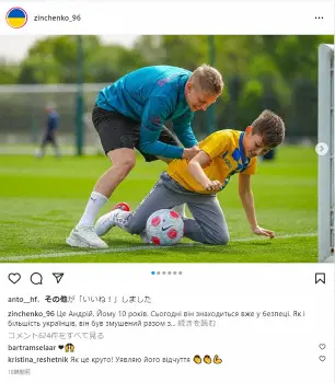 ジンチェンコは公式インスタグラムに少年との2ショット写真を載せ「彼は10歳の男の子です。この少年も多くのウクライナ人と同じように戦争のため家から逃げることを余儀なくされたのです。この75日前、少年はサッカー選手になることを夢見て、チームと一緒にのんびりとトレーニングをしていました。そして今日、彼の夢はただひとつ、祖国の平和だ」とコメント。クラブの練習に招待した少年について紹介した。