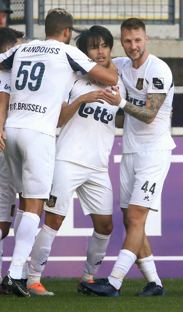アンデルレヒト戦の前半、先制ゴールを決め、祝福を受けるサンジロワーズの三笘(中央)