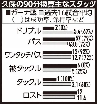 サッカー日本代表は10日に行われたキリン杯でガーナに4―1で快勝。インサイドハーフで出場したMF久保建英(21)のプレーを「データスタジアム」提供のスタッツで検証する。(記録課)