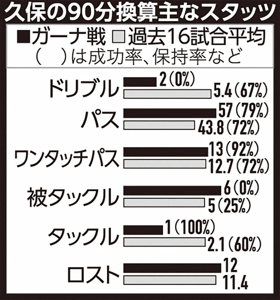 久保がボールをロストした回数は12で両チーム最多。過去に出場した16試合の90分平均と比較すると、ドリブル突破など敵陣で勝負するプレーが多い久保は、これまでもロストは11・4回と多いが、ガーナ戦はドリブル2回と少ないにもかかわらず平均よりも多い。後半10分には自陣近くでボールを奪われたが、低い位置でのロストは失点につながる危険性もある。