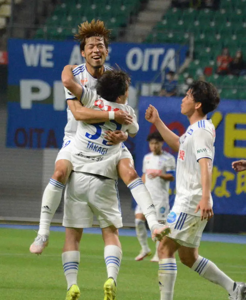 <大分・新潟>前半22分、先制弾を決めた高木にアシストした鈴木が抱きつく(撮影・渡辺直美)