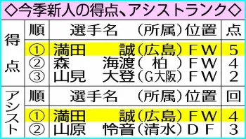 このペースでいくと新人では史上6人目、チームの日本人では15年佐藤寿人以来の2桁得点も見えてくる。このまま結果を残し続ければ、7月下旬に行われるE―1選手権での日本代表初招集にも期待が高まる。(データ提供・データスタジアム)